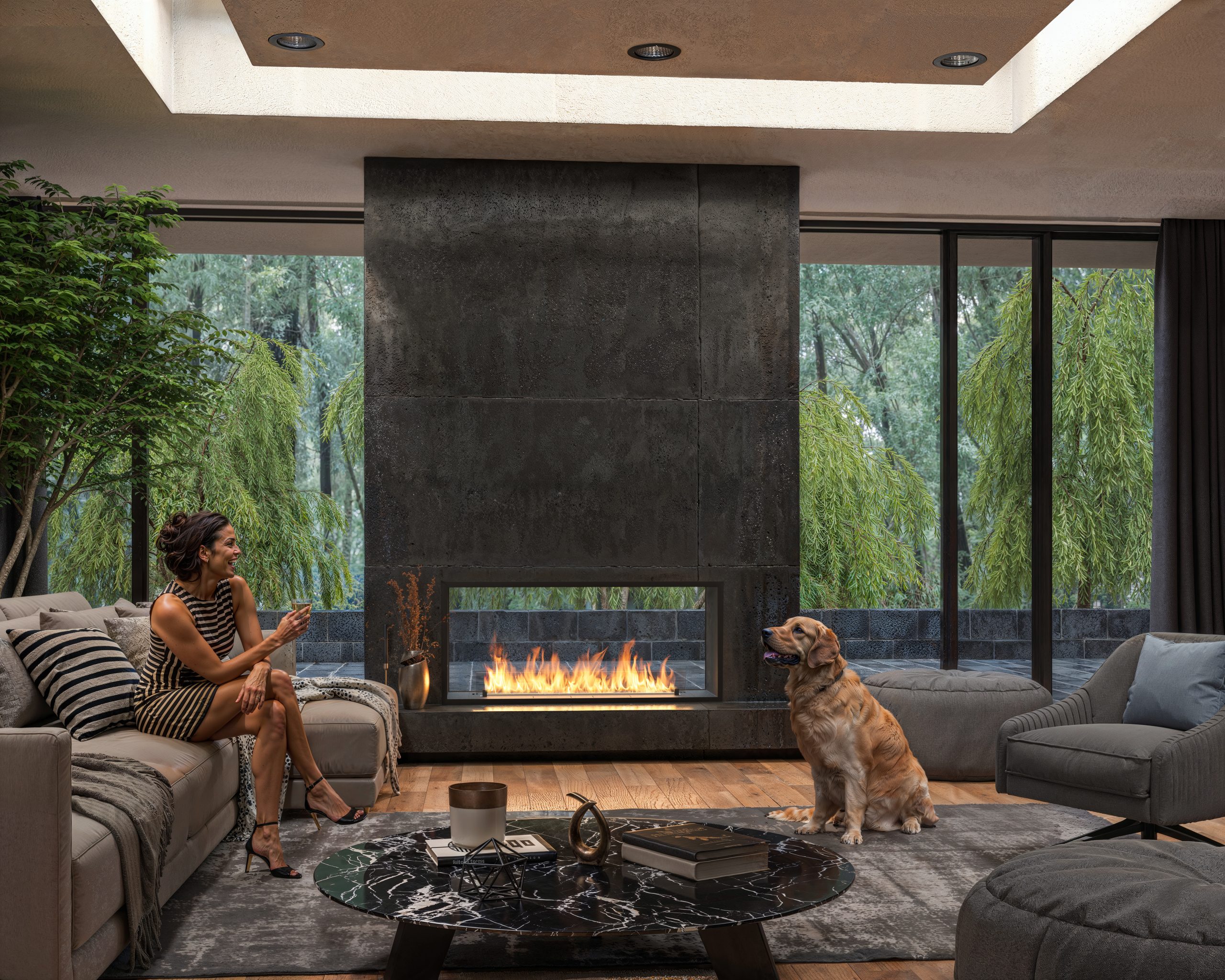 Pensato per l’installazione da incasso, il Biocamino ETRONIC 2Side 1200 si integra perfettamente in pareti divisorie, strutture architettoniche o progetti d’arredo su misura, diventando il protagonista discreto ma scenografico dell’ambiente e creando una suggestiva continuità visiva tra gli spazi.